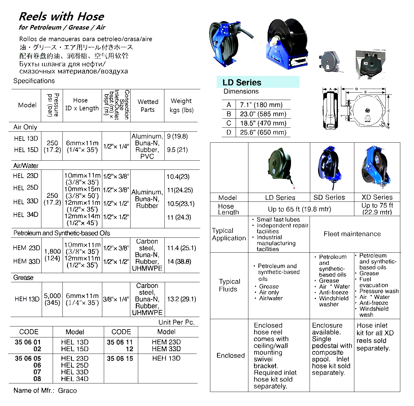 REELS WITH HOSE, LD SERIES, HEL 15D, GRACO – PC